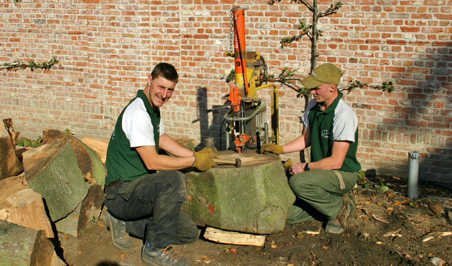 De stam werd verzaagd tot stukken van 40cm. Hier worden de stukken gekliefd tot kant-en-klaar brandhout.